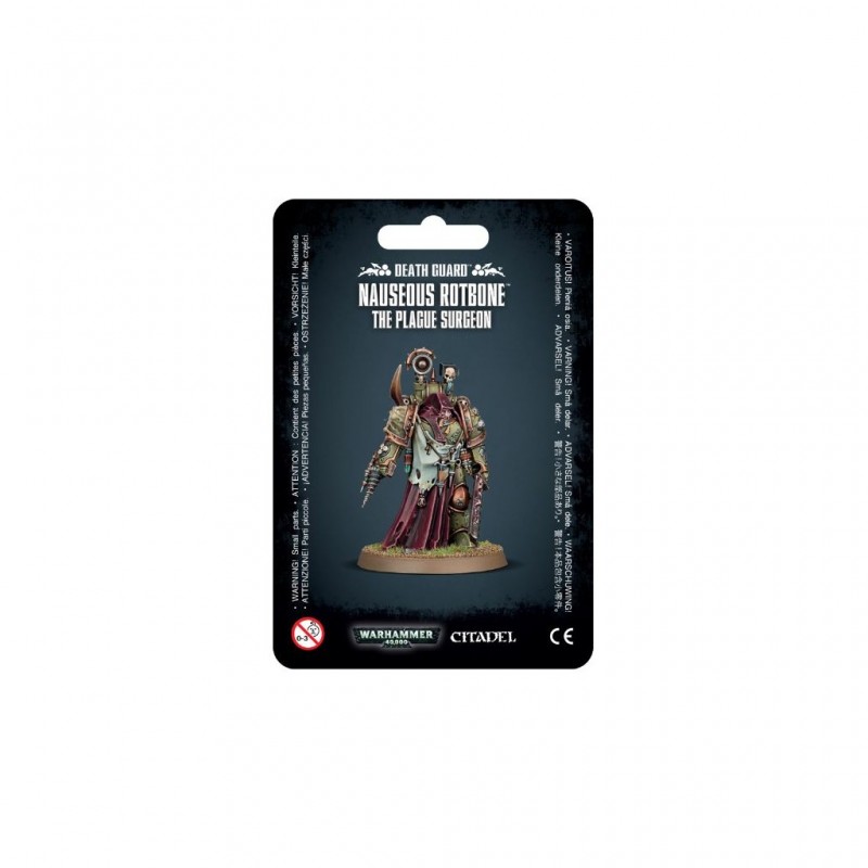 Ce kit plastique contient les composants nécessaires pour assembler Nauseous Rotbone, un Plague Surgeon de la Death Guard. Il porte un pistolet bolter et une pestelame, mais son véritable intérêt se trouve chez les instruments médicaux corrompus, dont une parodie de narthecium porteur de maladies, dont il est bardé. Il a même sur le bras droit un antique reductor rouillé spécialement pour prélever le génogerme. Sa robe de bure encapuchonnée dissimule en grande partie une armure piquetée de corrosion typique de la Death Guard. Son épaulière droite est ornée d'une tête de plaguebearer, et son appareillage dorsal est… mais mieux vaut ne pas en parler.