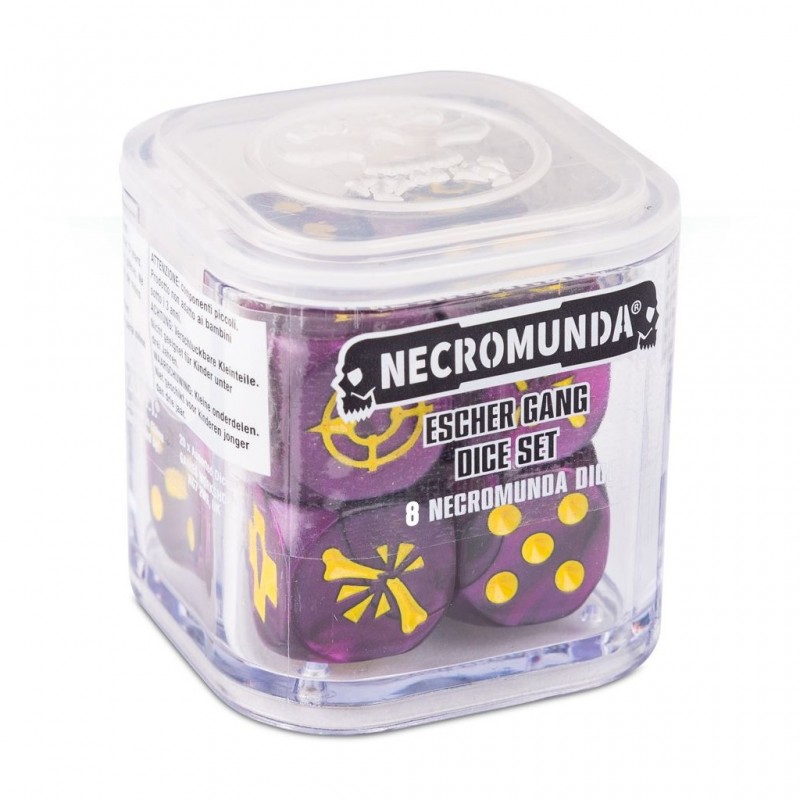 Conçu pour être assorti au gang Esher de Necromunda Underhive, ce set de 8 dés de 16mm est coloré en noir et violet metallisé, avec les chiffres et icônes en jaune. Le set comprend tous les dés nécessaires pour jouer à Necromunda: